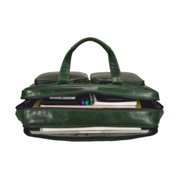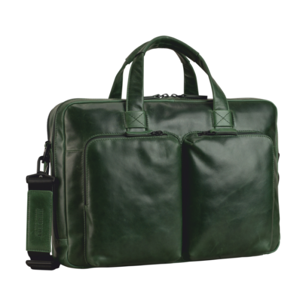 Diese luxuriöse, flaschengrün Ledertasche im sportlichen Look ist perfekt für Ihr Laptop und Tablet. Aus echtem Vollrindleder gefertigt, beeindruckt sie durch ihr Öl-Wachs Finish und den markanten Pull-Up-Effekt. Die zwei getrennten Fächer sorgen für eine optimale Organisation und einfachen Zugriff auf wichtige Dokumente, Laptop und Arbeitsutensilien. Zusätzlicher Stauraum in separaten Außentaschen ermöglicht die Aufbewahrung weiterer Dokumente. Der praktische Trolley Loop auf der Rückseite bietet sicheren Halt auf Rollgepäck. Mit kurzen Henkeln und Schulterriemen ist diese vielseitige Ledertasche das Must-have für jeden dynamischen, stilbewussten Geschäftsmann.