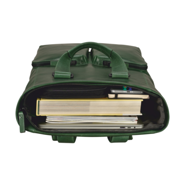 Dieser anspruchsvolle Tote Bag/Business-Rucksack in flaschengrüner Ausführung aus hochwertigem Vollrindleder mit Öl-Wachs Finish vereint durchdachte Funktionalität mit modernem Design. Der strukturierte Innenraum bietet organisierten Stauraum für umfangreiche Business-Unterlagen sowie technische Geräte. Die ergonomisch geformten Kurzhenkel gewährleisten optimale Tragbarkeit bei täglichem Einsatz. Mit diesem vielseitigen Tote Bag / Rucksack ergänzen Sie professionell Ihr Business-Outfit und bewältigen anspruchsvolle Arbeitstage mit praktischer Eleganz.